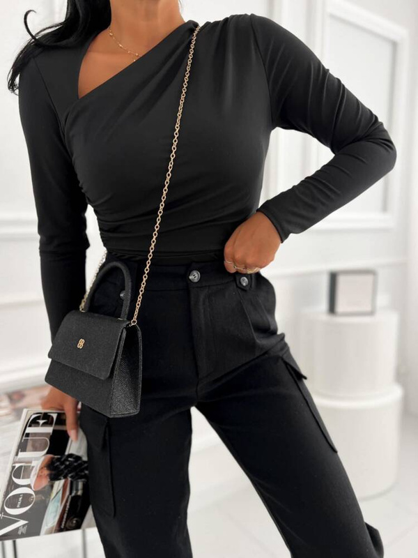 Elegancka czarna bluzka damska Veronica z przekładanym dekoltem i długim rękawem.