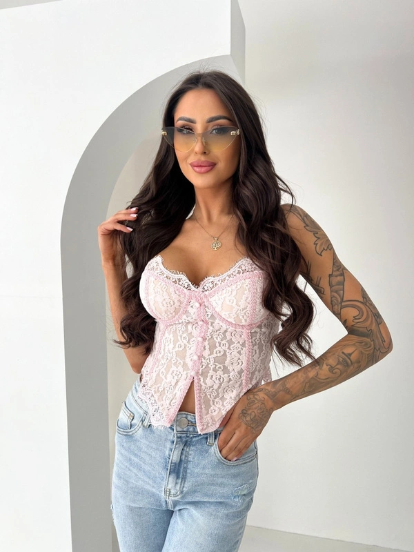 Rożowy koronkowy top damski na ramiączkach z kwiatowym wzorem - crop top