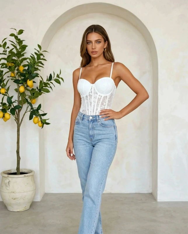 Koronkowe body damskie białe z głębokim dekoltem V - elegancka bielizna i bluzka 2w1
