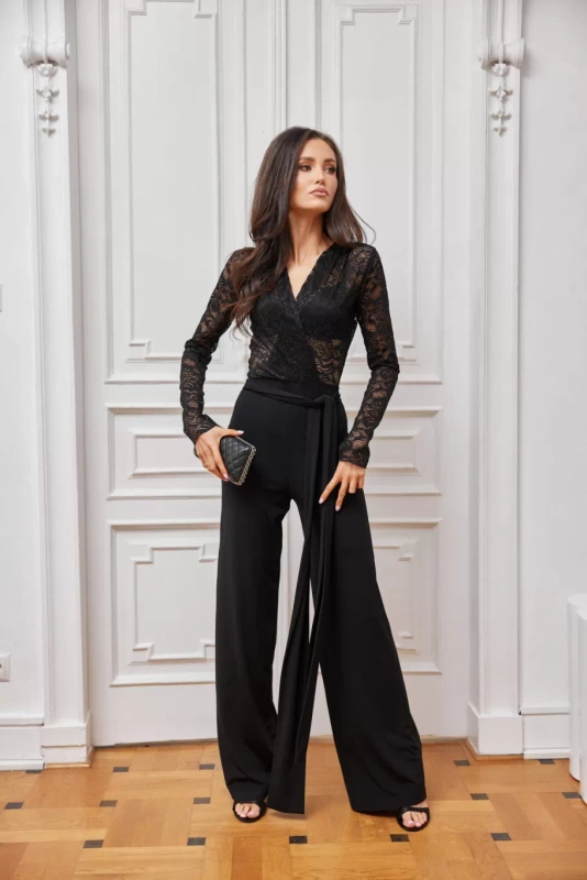Damski kombinezon z szerokimi nogawkami i kopertowym dekoltem czarny