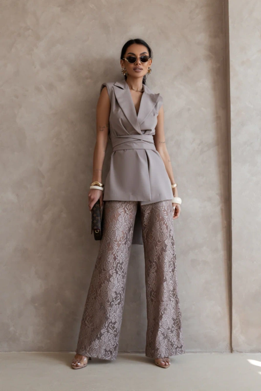 Beżowy Komplet Damski Kamizelka z Baskinką Szerokie Spodnie Wysoki Stan