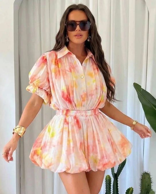 Komplet damski letni koszula z bufiastym rękawem i szorty pastelowy wzór