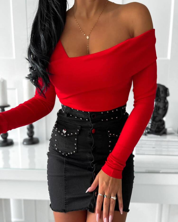 Elegancka czerwona bluzka damska Veronica z przekładanym dekoltem i długim rękawem.