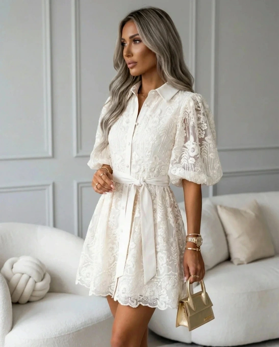 Sukienka koronkowa beżowa GLAMOUR elegancka z bufiastymi rękawami na wesele