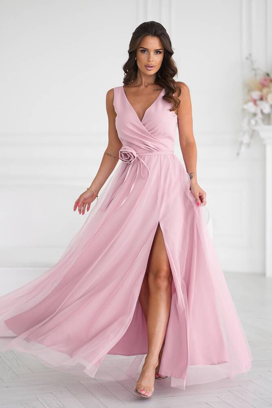 Tiulowa pudrowa sukienka wieczorowa maxi na ramiączkach z dekoltem V