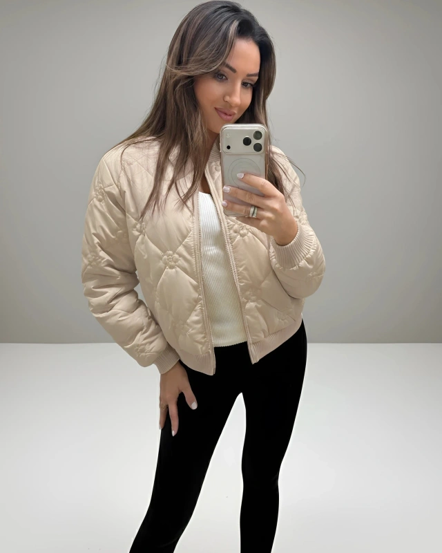 Pikowana Kurtka Bomberka Damska Beżowa Wiosenna z Kwiatowym Przeszyciem