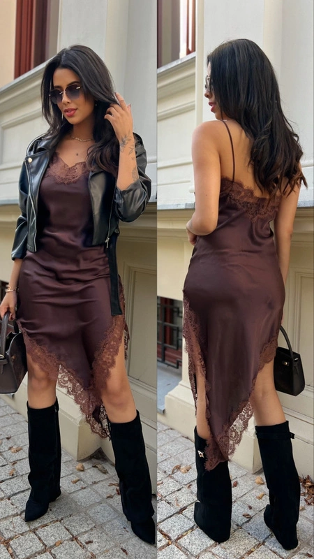 Czekoladowa sukienka satynowa z koronką na imprezę wesele