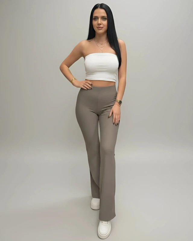 Spodnie Dzwony Damskie Modelujące Prążkowane Wysoki Stan Khaki Elastyczne