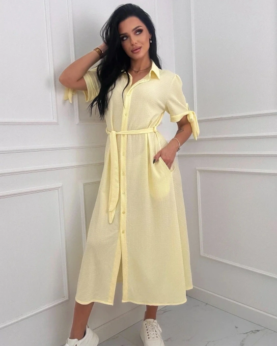 Sukienka koszulowa midi żółta z paskiem i kieszeniami - letnia elegancja damska