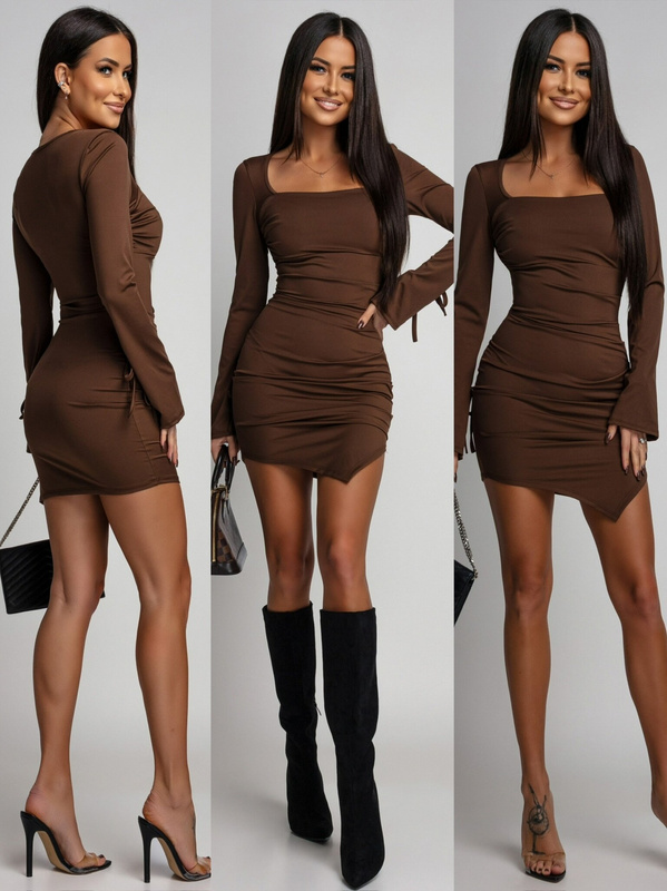 ELEGANCKA MINI DOPASOWANA SUKIENKA z długim rekawm Victoria czekoladowy