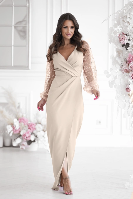 Elegancka Sukienka FLOWERS z długim rękawem beżowy