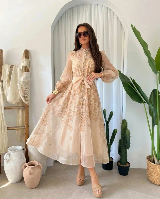 Elegancka Sukienka Maxi Beżowa w Kwiaty z Transparentnymi Rękawami na Wesele