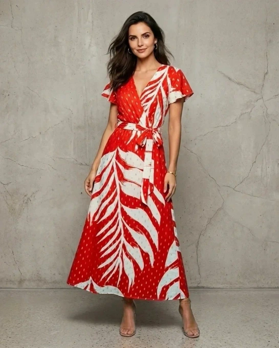 Sukienka midi czerwona z tropikalnym nadrukiem liści palmowych wiązanie w talii lato 2025