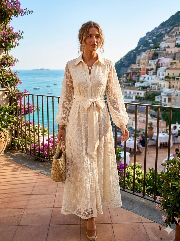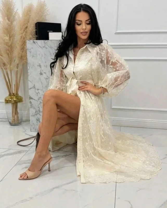 Kremowa Sukienka Maxi Koronkowa w Kwiaty z Bufiastymi Rękawami na Wesele
