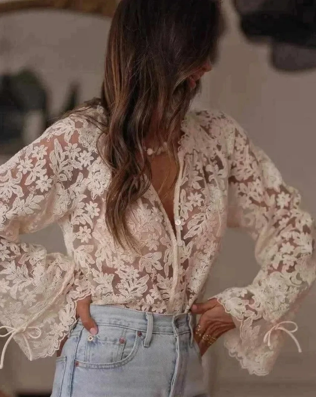 Koszula damska koronkowa beżowa z kwiatowym haftem - romantyczna bluzka