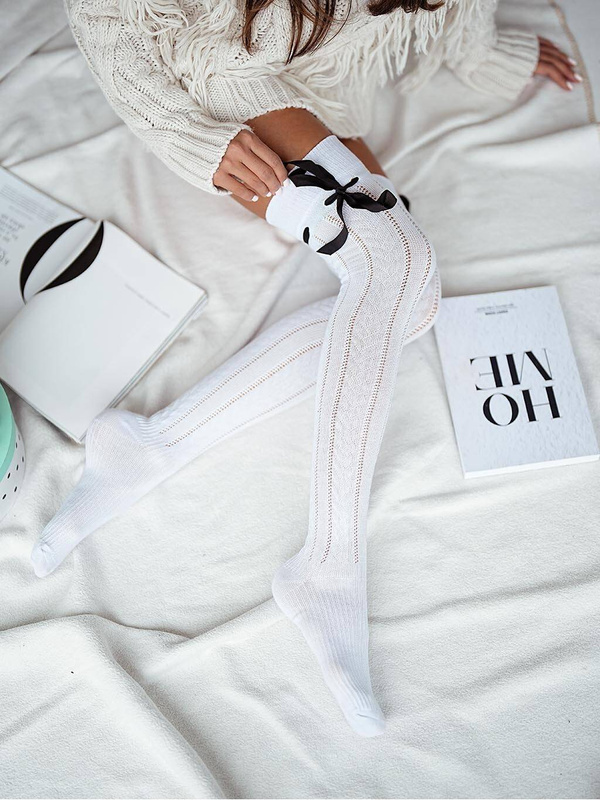 Damskie zakolanówki świąteczne ażurowe warkocz ze wstążką białe