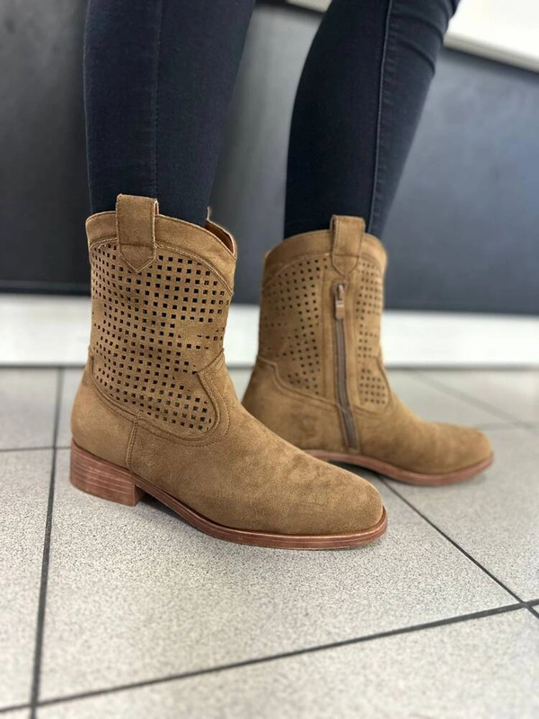 Płaskie Botki Sztyblety z Ażurowym Wzorem- camel