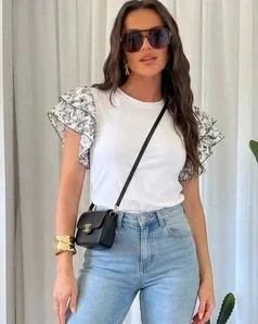 Najczęściej widzimy ją z jeansami mom fit - klasyka. Do pracy pasują spodnie z wysokim stanem, cygaretki. Zimą można ją założyć pod sweter oversize i zostawić widoczne same falbany - wygląda ciekawie. Ze spódnicą midi i szpilkami masz gotowy zestaw na kolację.
