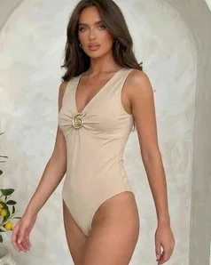 Błękitne body z głębokim dekoltem V i złotą spiralą - taki detal, który od razu rzuca się w oczy. Nie trzeba już zakładać naszyjnika, bo spirala robi robotę.