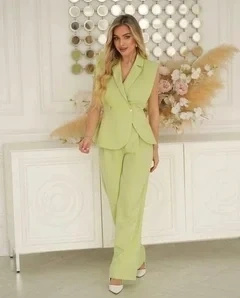 Różowy komplet na wyjścia - kamizelka z baskinką i szerokie spodnie palazzo. Pudrowy odcień, który pasuje praktycznie do każdej karnacji.