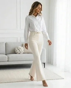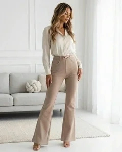 Spodnie ecru z wysokim stanem i rozszerzaną nogawką. Wysoki stan robi dwie rzeczy: optycznie wydłuża nogi i trzyma brzuch. Rozszerzane nogawki balansują szersze biodra - widzimy to u klientek codziennie. Materiał odporny na zagniecenia, co sprawdzisz sama po całym dniu siedzenia.