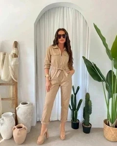 Beżowy kombinezon damski - jeden ciuch i masz gotową stylizację. Rano nie musisz się zastanawiać, co do czego pasuje.