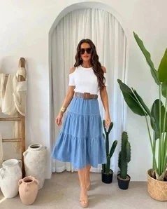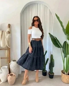Rozkloszowany dół z marszczeniami na trzech poziomach - przy chodzeniu spódnica ładnie faluje. Wysoki stan trzyma się w talii bez zsuwania. Długość midi (do połowy łydki) sprawdza się przy wzroście 160-175 cm. Pasek można regulować, więc jeśli wahasz się między rozmiarem S a M - spokojnie, dopasowanie da się skorygować.