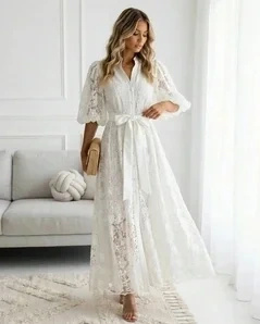 Koronkowa sukienka w kolorze białym, długość maxi. Kwiatowy wzór koronki jest dość drobny, więc nie przytłacza sylwetki. Bufiaste rękawy sięgają do łokcia i dodają całości romantycznego klimatu. Pasek w talii wiążesz sama, więc możesz go dopasować do swojej figury - luźniej lub ciaśniej.