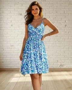 Czy marzysz o sukience, która sprawi, że poczujesz się wyjątkowo każdego letniego dnia? Nasza zwiewna sukienka letnia w hipnotyzujących odcieniach niebieskiego to odpowiedź na Twoje poszukiwania idealnej kreacji na ciepłe dni. Wyobraź sobie siebie spacerującą nadmorską promenadą, gdy lekka wiskoza delikatnie muska Twoją skórę, a rozkloszowany dół sukienki tańczy w rytm letniego wiatru.