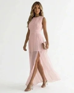 Fason maxi, plisy układają się przy każdym kroku. Rozcięcie sięga mniej więcej do połowy uda - dodaje charakteru, ale nie jest przesadzone. Bez rękawów, więc ramiona są odsłonięte. Na wiosnę i lato w sam raz.