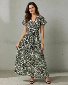 Sukienka maxi w liście została zaprojektowana z myślą o kobietach, które cenią sobie wygodę bez rezygnacji ze stylu. Uniwersalny krój sprawia, że doskonale prezentuje się na różnych typach sylwetki. Wiązanie w talii pozwala na indywidualne dopasowanie i optyczne wyszczuplenie figury. To idealny wybór dla pań szukających eleganckiej sukienki na lato.
