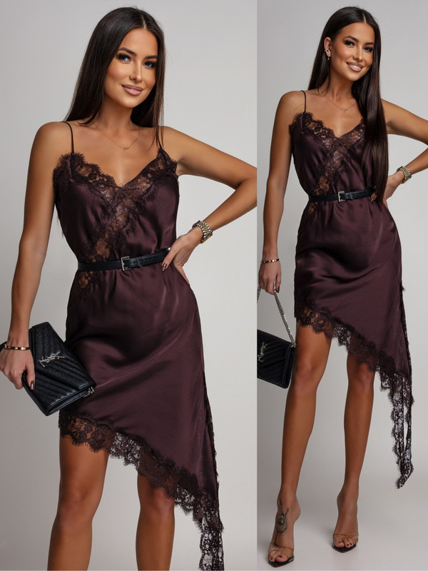 Asymetryczna sukienka satynowa z koronką w kolorze czekoladowym